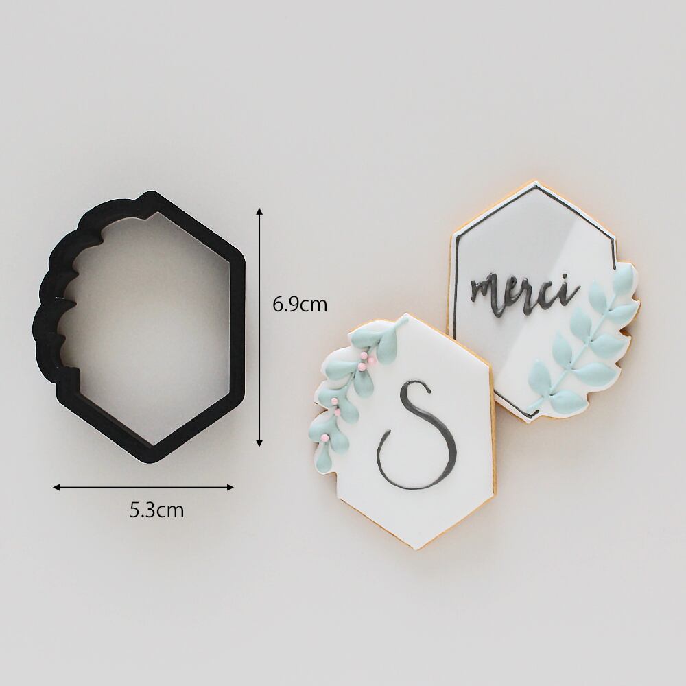 細長い六角形をベースとしたボタニカルフレームです。
